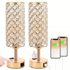 2 Golden Crystal Desk Lamps with Touch Dimmable Table Lights, USB-A+C and Single AC Two-Prong Plug, Suitable for Office, Living Room, Bedroom, with Bulb