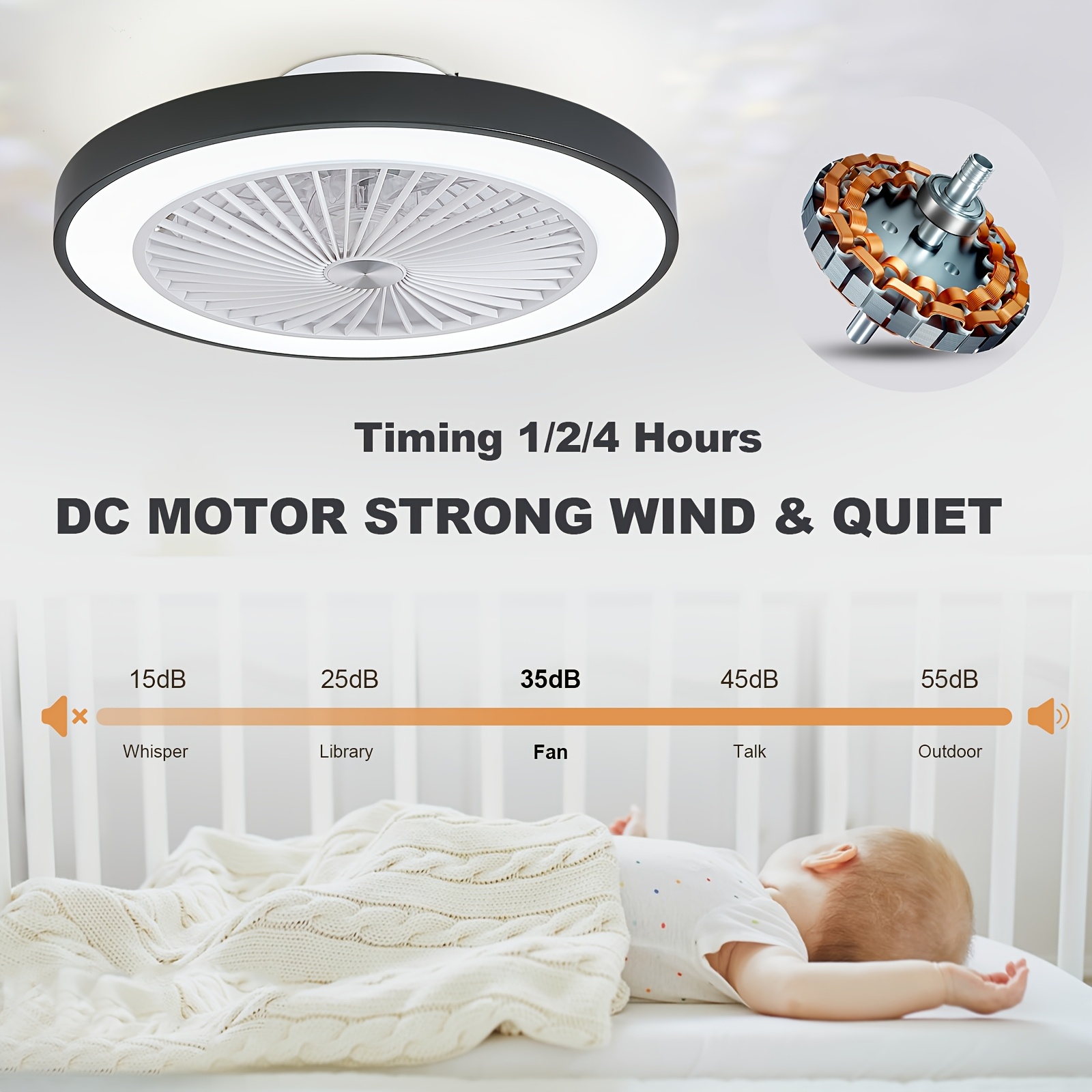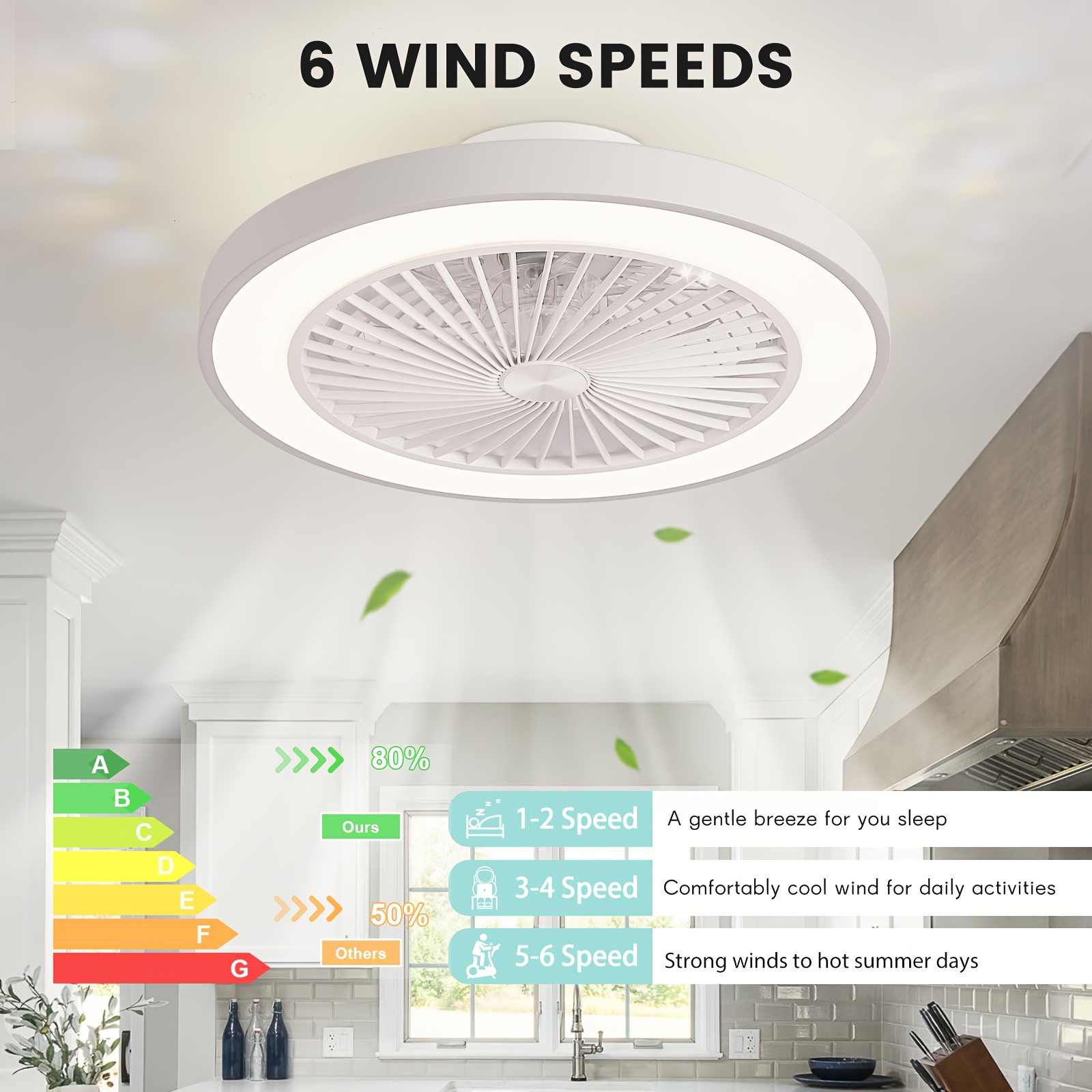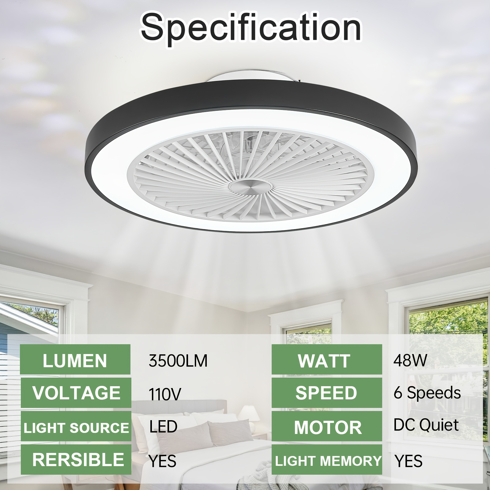 Modern 19" Bladeless Flush Mount Ceiling Fan with LED Light - 48W, 6 Speeds, Quiet, Dimmable, Reversible, Low Profile Design for Dining Room, Living Room, Kitchen, Youngsters' Room, Ceiling Fan Light
