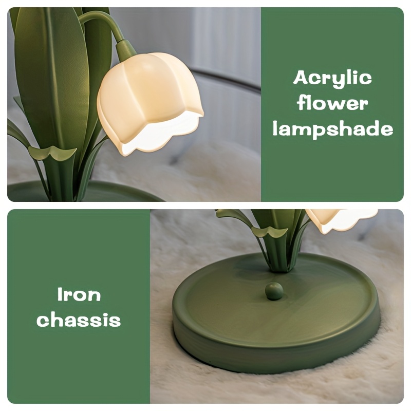 Modern Green Lily-of-the-Valley Table Lamp with Flower-Shaped Shade - Plug-in White Bulb (Compatible with E27), Soft Glow Night Light for Bedroom, Living Room,, Hotels & B&Bs - Glossy Plastic/Metal Bell Lighting Fixture