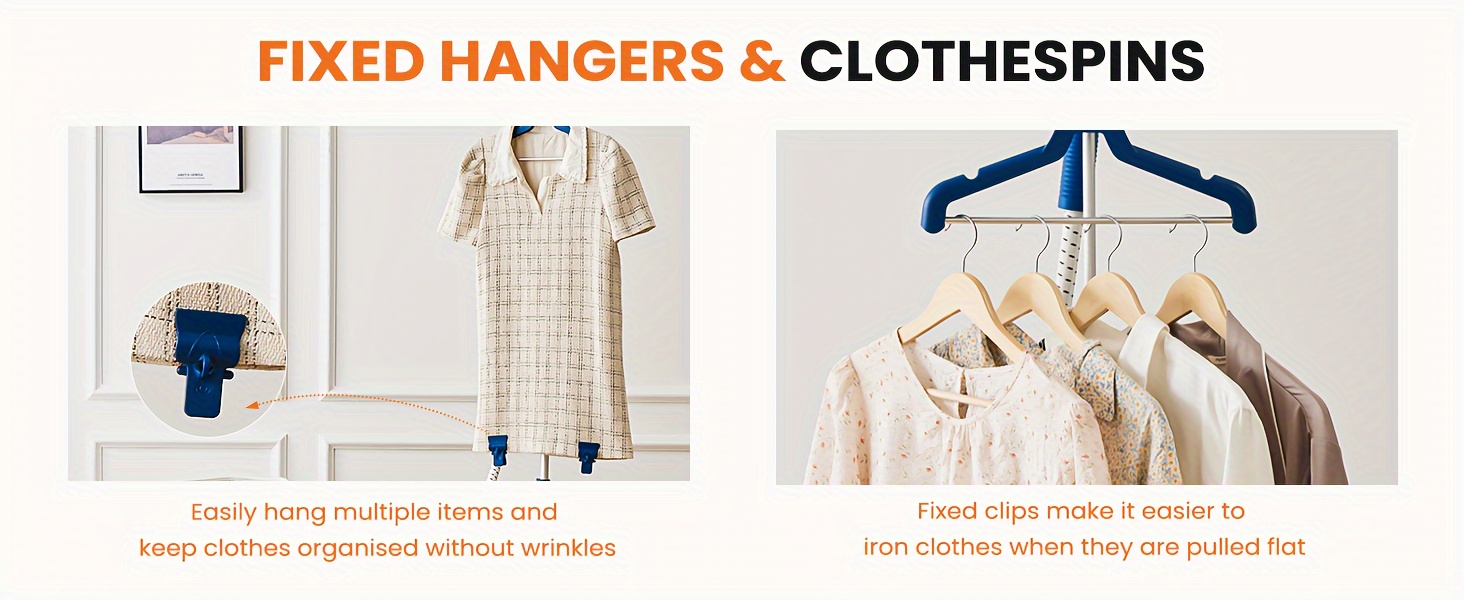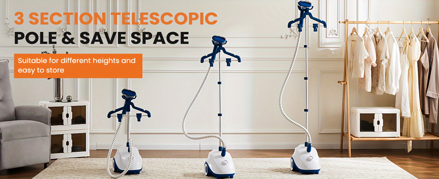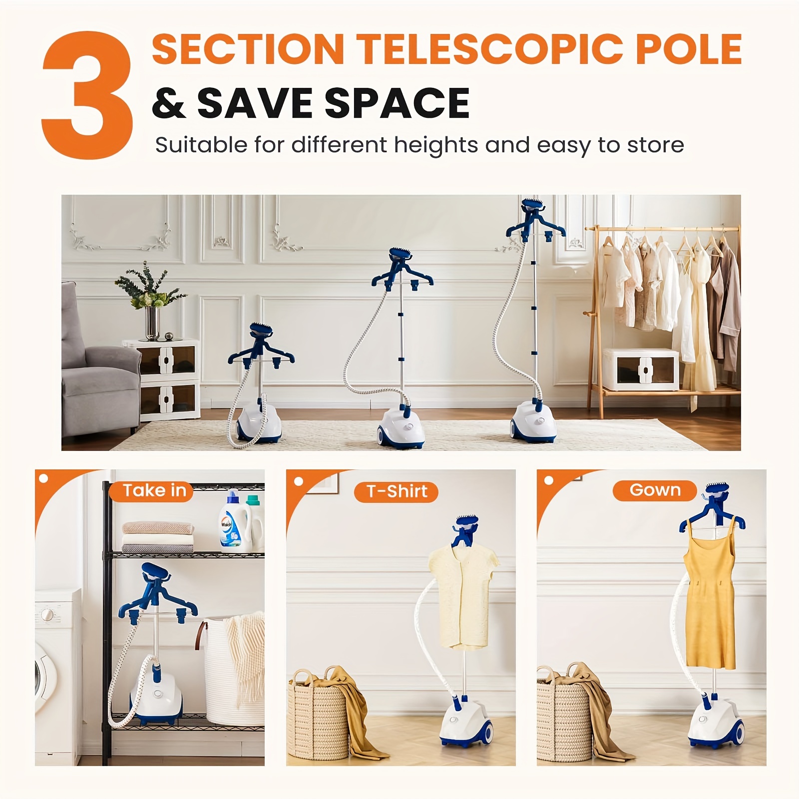 tanding Garment Steamer With Roll Wheels For Easy Movement, Water Tank For 1 Hour Continuous Steaming, Adjustable Pole For Storage, Easy-Roll Wheels, Garment Hanger, & Fabric Brush